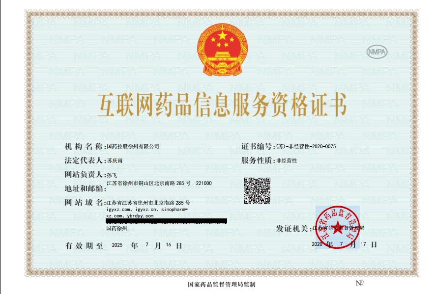 0516-8010-1098 江蘇省徐州市高新技術開發(fā)區(qū) 北京南路283號萬泰廣場1號樓7-13層 互聯(lián)網(wǎng)藥品信息服務資格證書